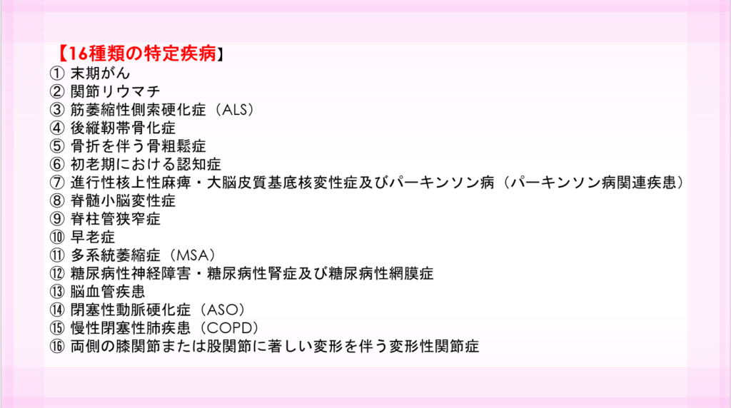 16特定疾病とは、介護保険制度の中で定められた特定の疾病群です。